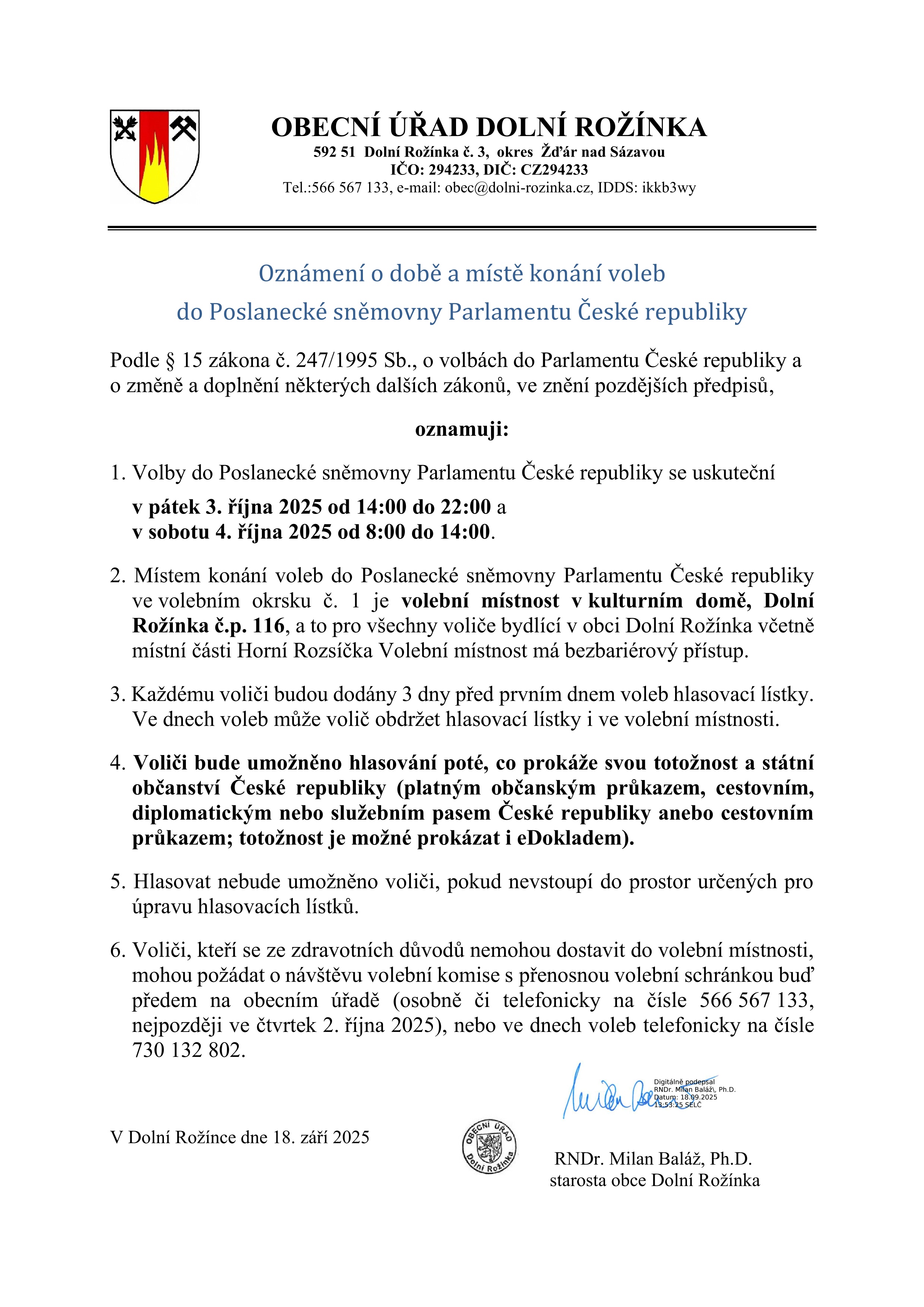 Volby do Poslanecké sněmovny Parlamentu ČR 1.10.2025 Vystavil: Milan Baláž Sdílet Sdílet Klikněte pro zkopírování URL Facebook Místem konání voleb je volební místnost v kulturním domě, Dolní Rožínka č.p. 116, volby se konají v pátek 3. října 2025 od 14:00 do 22:00 a v sobotu 4. října 2025 od 8:00 do 14:00.Bližší informace viz přiložené oznámení.