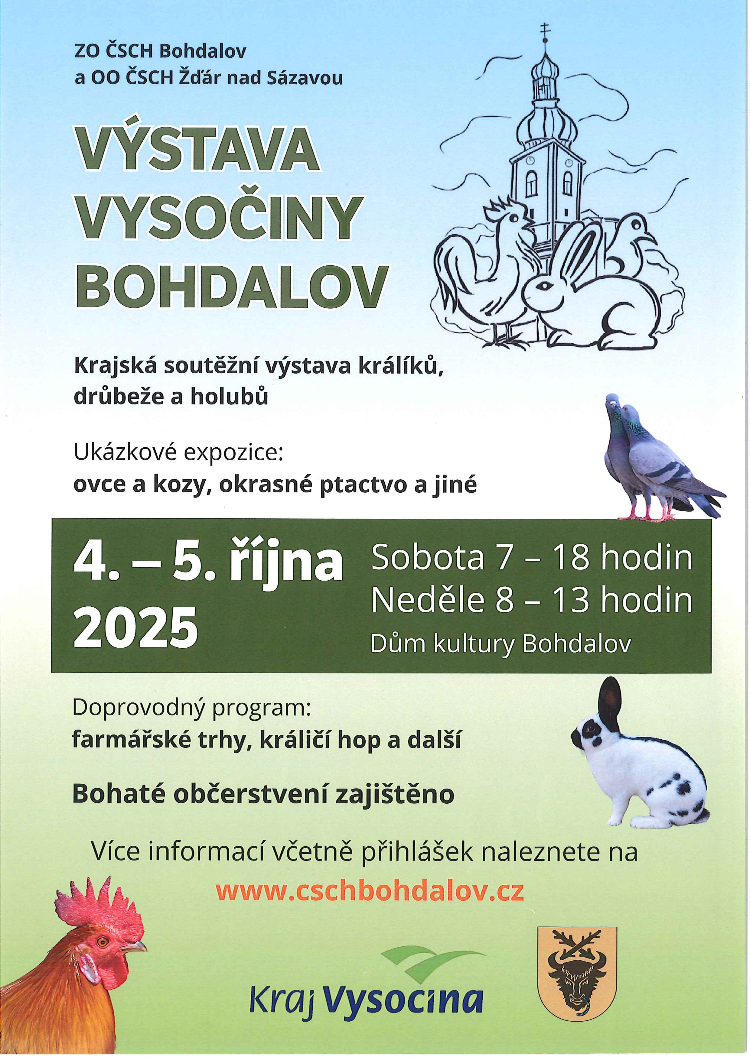 Výstava Vysočiny, Bohdalov, 4. a 5. října 2025 1.10.2025 Vystavil: Milan Baláž Sdílet Sdílet Klikněte pro zkopírování URL Facebook Výstava králíků, drůbeže, holubů, ovcí, koz, okrasného ptactva apod. Detaily viz přiložený leták akce.
